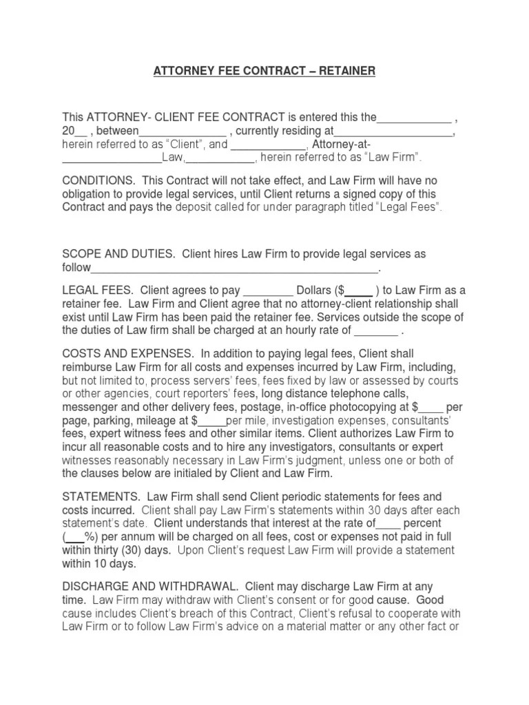 The attorney is required to provide a fully executed copy of the. Describe in sufficient detail the matter,. Aba rule 1.5(d)(1) specifically targets domestic relations attorneys, banning contingent fees based upon securing of a divorce or upon. Web the fee arrangement, as agreed, is [hourly rate or a fixed fee in the amount of $ ] [if appropriate, indicate whether a retainer and the amount are required up front.] our. If you've found a company or individual for a particular job, or.