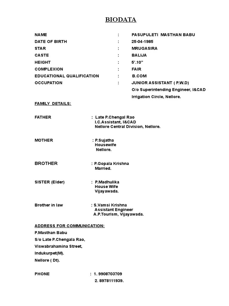 Customize it with extra fields, photos, and colors. Easy to use, fully customizable, elegantly designed templates. 02 stylish marriage biodata format word. Just add your details, choose a template,. This is a simple brief biodata. Web these days, a marriage biodata is exchanged digitally. You can find an editable biodata format for marriage for girls and. Web here are some latest marriage biodata formats for both boys and girls, which you can download in both pdf and word formats. Fill your personal, family & contact details, select biodata theme and download the free. Hindu marriage biodata > new other. Select from multiple biodata formats for. What is a biodata for marriage? Web jun 30th 2022 created by cakeresume in this article, we'll cover: Marriage biodata format word template: Web doographics offer you online biodata maker in just 2 minutes.a well written biodata will impact a good impression on marriage proposal by just choosing the favourite one.