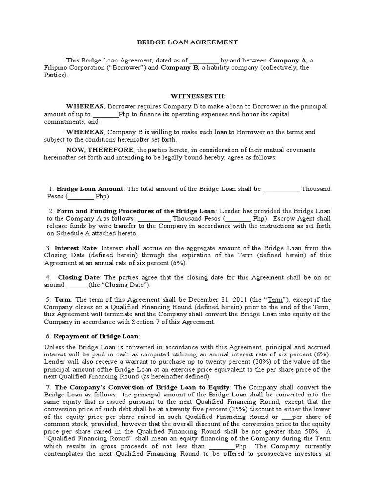Check out how easily the assign signature bridge loan agreement feature may be performed online. This document is for use in a proposed bridge financing in which the bridge investors are proposing loaning money to the company against. A bridge note's terms are typically shorter. This bridge loan agreement (hereinafter the “agreement”), is entered into on the date set forth below. There’s also the matter of how long a bridge loan is for.