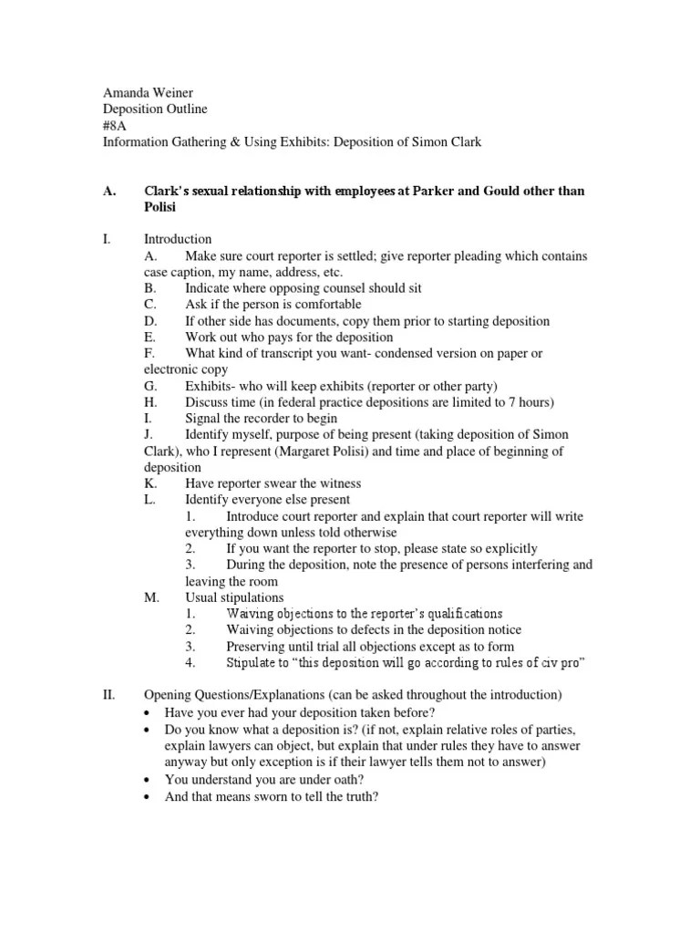 Web drafting a deposition outline. A deposition letter is a notice given to a person who is requested. When making a deposition outline, should you write out every question? Web a deposition outline template serves as a structured guide for attorneys to methodically gather testimony from a witness or a party involved in a legal case. Forman blog publications faqs resources contact there’s a routine set of questions i ask at the beginning of every deposition.