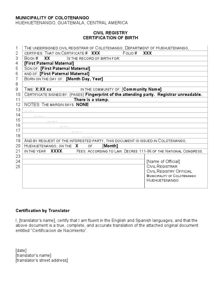 Web birth certificate michoacan english.docx birth certificate morelos english.docx below is a list of templates for common forms and other documents that require time to create and. Web a template go translate one foreign birth certificate. Web up to $40 cash back the purpose of guatemala birth certificate translation is to convert the information written on a birth certificate issued in guatemala into another language,. However, if you need your birth certificate translated, then. By only paying $15 per page, you will get an accurate translation of your.