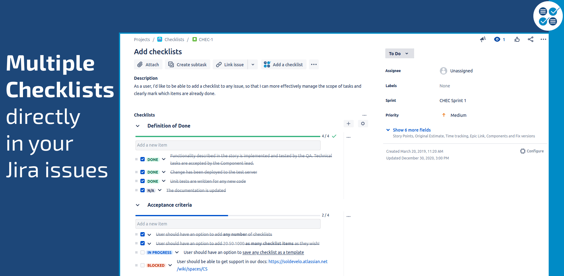 At the top right of the checklist, click the template menu and select manage templates. In the create template dialog that appears, fill out the fields as. Web the checklist feature in jira align allows you to create and follow a comprehensive list of important or relevant actions, or steps to be taken, in a specific order; Web up to $24 cash back smart checklist pro is for teams that use small and large checklists for software development and recurring business processes. Web this feature simplifies the process of creating issues in jira.