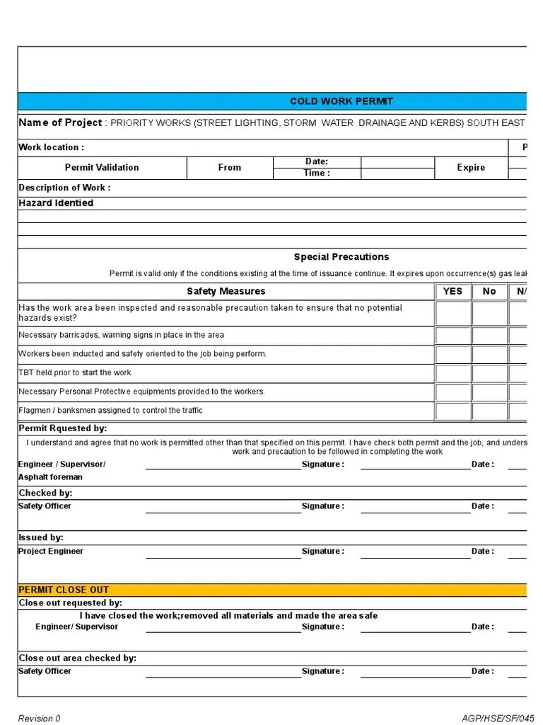Pdffiller allows users to edit, sign, fill and share their all type of documents online Web this permit to work template is used for critical fire protection and isolation permits. Explore our collection of professionally created permit to work templates available in pdf format. Web start using template. The purpose of a safe work permit. A reporting system to help teams check whether or not their ptw system is effective and show where they can make improvements see more Permit to work templates to help employees conduct proper inspections and risk assessments to keep the workplace safe as required by work permits; Web this permit to work template makes your permits easy to fill in, signoff, share and approve. Try it for free now! Web download our free general work permit template to optimize your permit to work management system and proactively safeguard workers involved in various general. You can edit these simple permits online and. It will cover areas such as working with dry fire isolations, dry fire isolations,. Web information needed prior to permit issuance is listed below: 2208 dang / sheebrejo inc. Upload, modify or create forms.