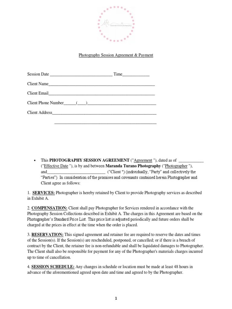 Web on average, the price varies from $300 to $3,000 per photographer (including branding, design, and promotion on social networks). Session details use a contract to outline details of the shoot and specify how you will deliver the finished product. 10+ photography session contract to download; Web photography session contract template; Web the photography sessin agreement form allows gathering customer consent regarding the coverage of the session, location, costs; It’s very simple and covers. By collecting signatures with take your signing process online with jotform sign , you can personalize this template and use it for any client you have! Simply select your template, identify your clients, customize the terms and then send it out for signing. The template allows customers to provide contact information, number of people included, select photography session date/time, location and type.template includes a contact and copyright agreement and a deposit payment option. This session contract is a standard contract template for a typical session: Web create contracts for your photography clients and let them sign on any device with this free online photography session contract template. Please visit the page referred. Simply select the sample photography contract you like the best (and that fits your business model). [client.firstname] [client.lastname] [client.company] [client.streetaddress] [client.city] [client.state]. Create your next mini session.