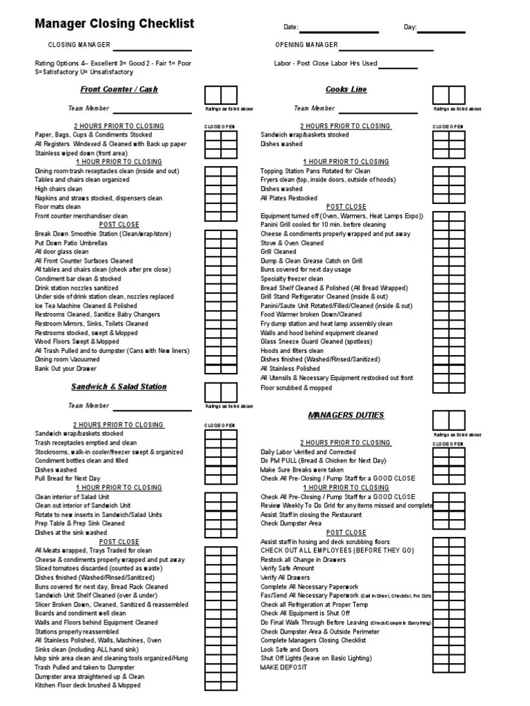 Web closing a venue can be tiring if you are open late hours or the manager has been working overtime, so a checklist can be an easy way to make sure everything gets done. To stay organized, it’s best to have a shift report template so your managers don’t forget to add details. Thank you for your interest and your enthusiasm in developing your own personal food safety system. Web free restaurant closing checklist template make sure that closing duties are completed every time with this free restaurant closing checklist outline all closing. Simple manager closing checklist template 3.